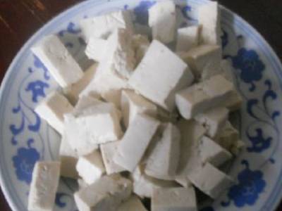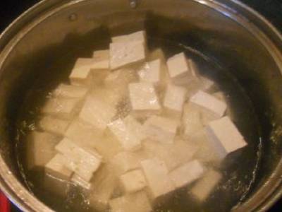 1、将豆腐切成小块,放入加盐的沸水中焯2-3分钟。